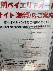 上のような貼り紙をトイレの入口で見つけたためこのベイエリアオートサイトに行ってみることにしました。