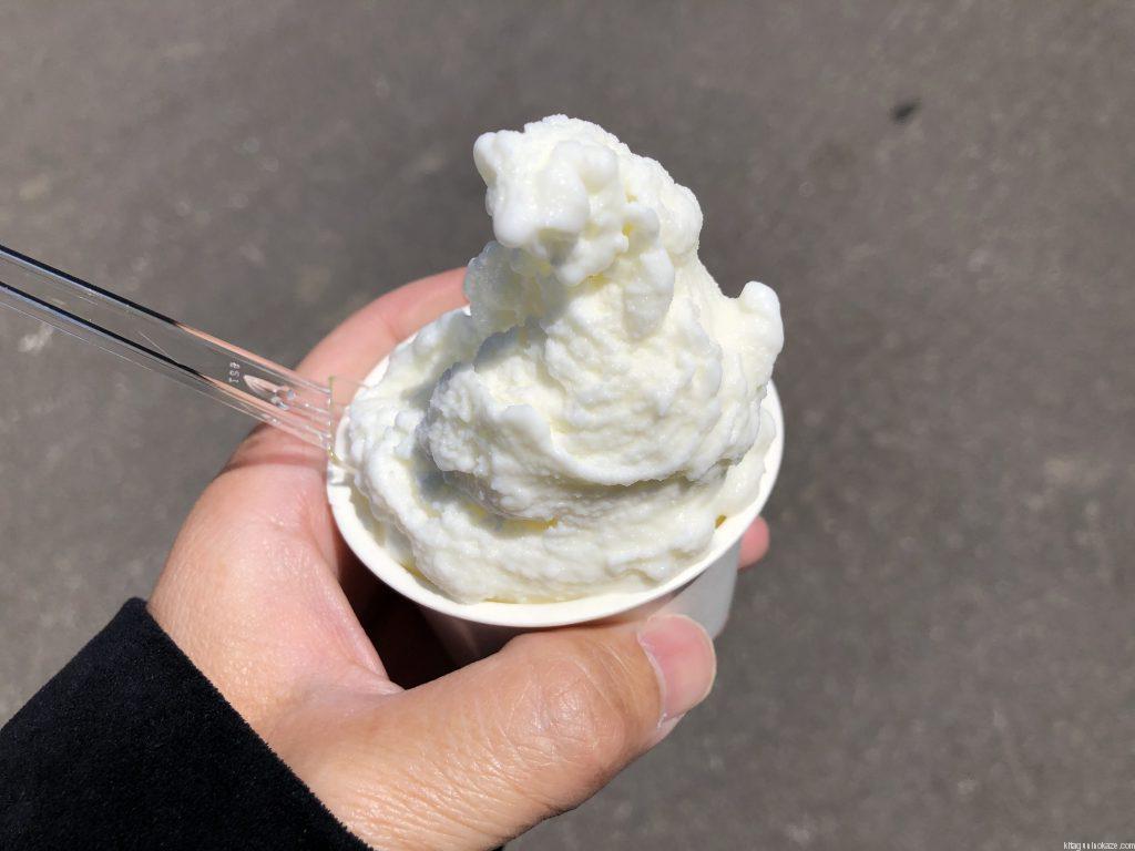 こちらはあかいがわジェラートというお店の人気商品、お米のジェラートシングル(350円、JAF会員は50円引き)です。