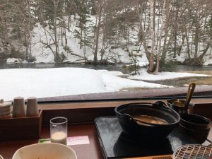 ちなみに朝食会場窓側から阿寒川の景色がみれます。食事始めてすぐの時間帯はすぐ目の前で鹿が寝転がっていました。