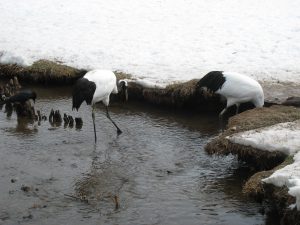 この自然公園内では柵の中でタンチョウが餌付けされているようで、天井に柵はありません。