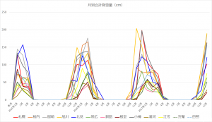 北海道の都市の月別合計降雪量