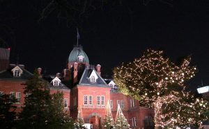 上の写真はさっぽろホワイトイルミネーション北3条広場[アカプラ]会場の夜景です。奥に見えるのは北海道庁旧本庁舎(赤れんが庁舎)です。